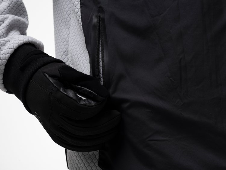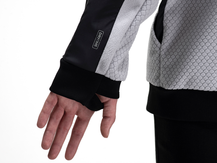 Rib cuffs with thumbholes to keep your hands warm and the sleeves in place.