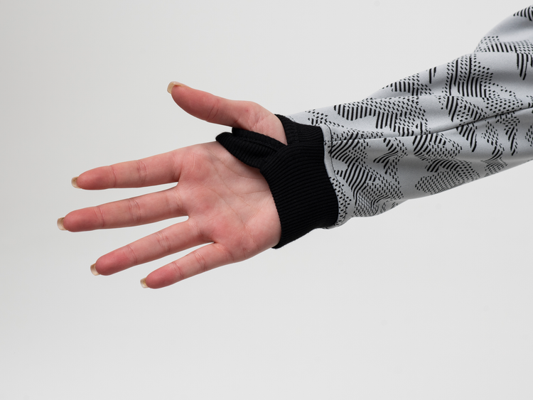Rib cuffs with thumbholes to keep your hands warm and the sleeves in place