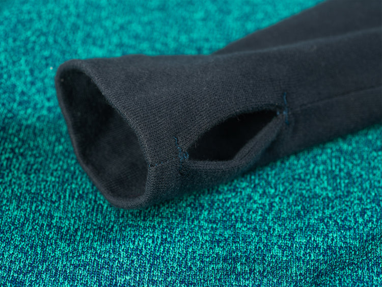Rib cuffs with thumbholes to keep your hands warm and the sleeves in place